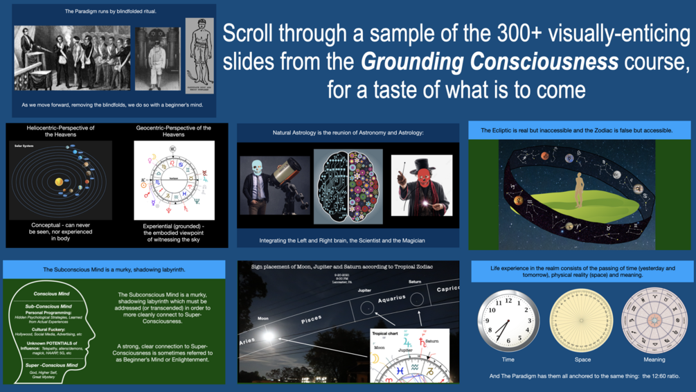 Grounding Consciousness isn’t about adding new beliefs — it’s about stripping away false ones. Across 28 modules (4.5 hours of video + 300+ slides), this course explores how reality and your mind actually work. Designed for astrologers willing to question received teachings — and for anyone seeking freedom from subconscious influence — the program reconnects you to natural rhythms. By the end, you won’t just think differently; your life will reflect the shift.